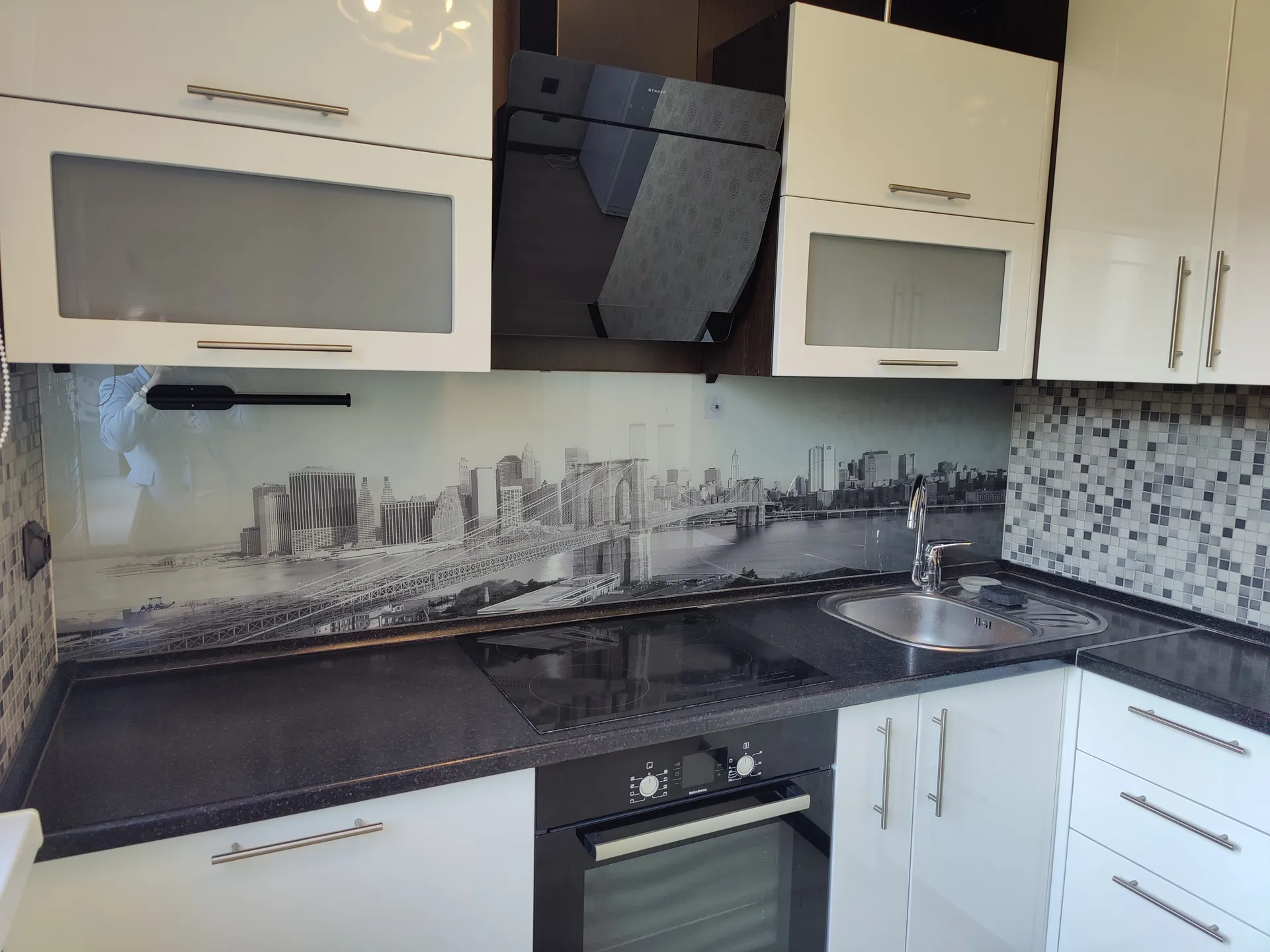Кухня: Встроенная техника (индукционная стеклокерамическая панель, вытяжка), современный гарнитур, обеденный стол со стульями.
